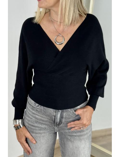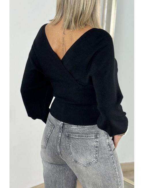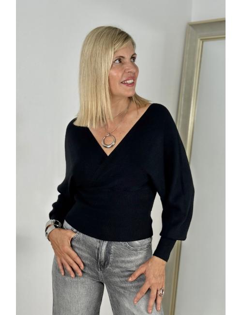 Jersey cruzado delante y detrás confeccionado en punto fino élástico. Manga larga ligeramente abullonada. Cuello en V tanto delante como en la espalda.