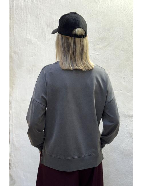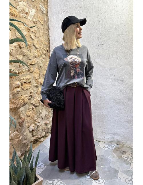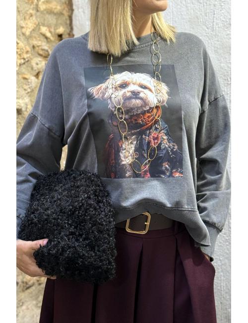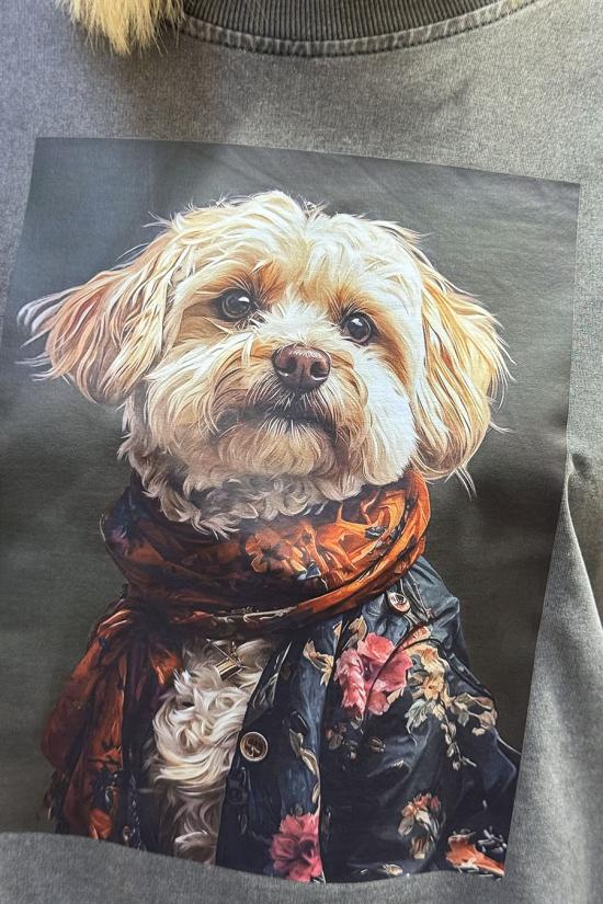 Sudadera oversize delavada con print delante de un perrito raza Shih Tzu, vestido con una chaqueta estampada con motivos florales y una bufanda de tonos rojizos y anaranjados. Hombros caídos y cuello redondo.