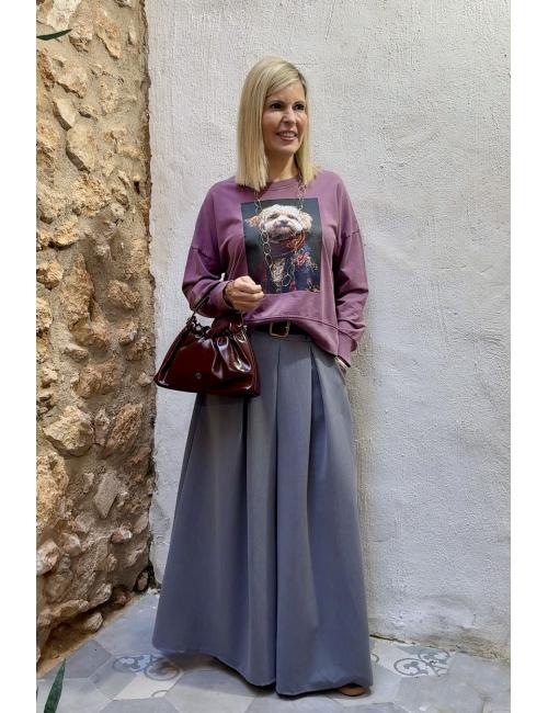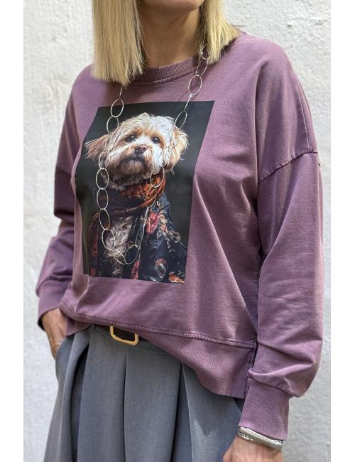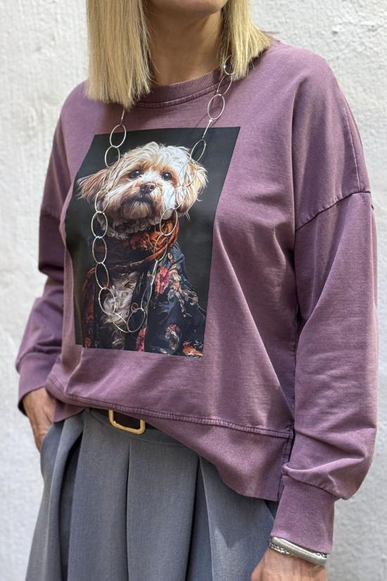 Sudadera oversize delavada con print delante de un perrito raza Shih Tzu, vestido con una chaqueta estampada con motivos florales y una bufanda de tonos rojizos y anaranjados. Hombros caídos y cuello redondo.