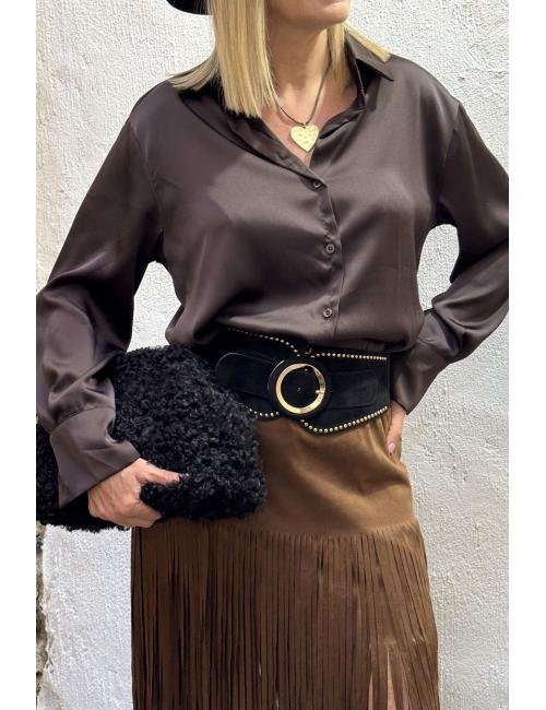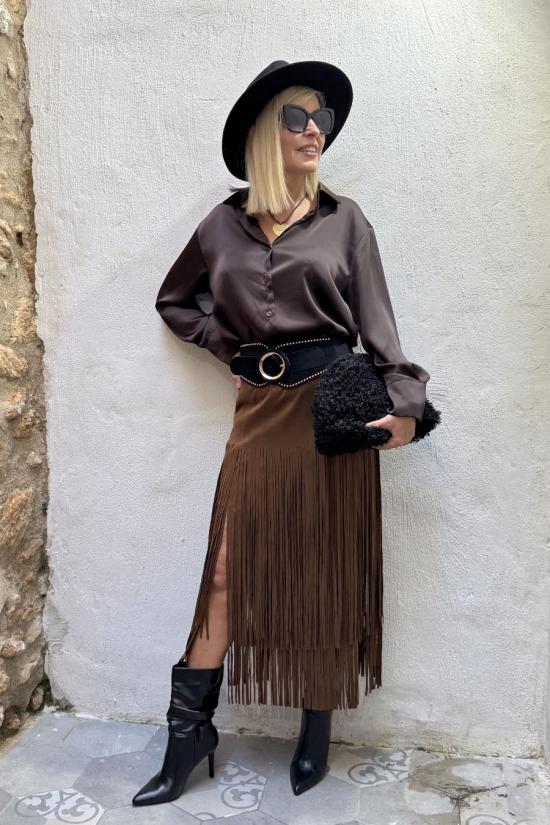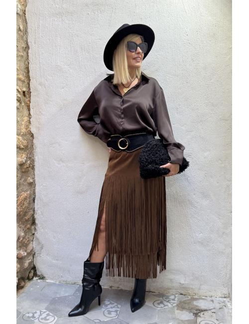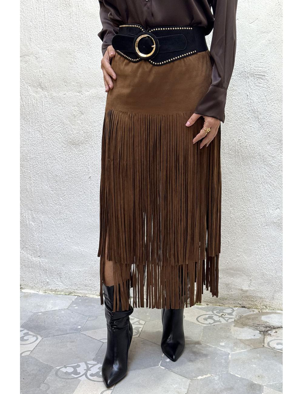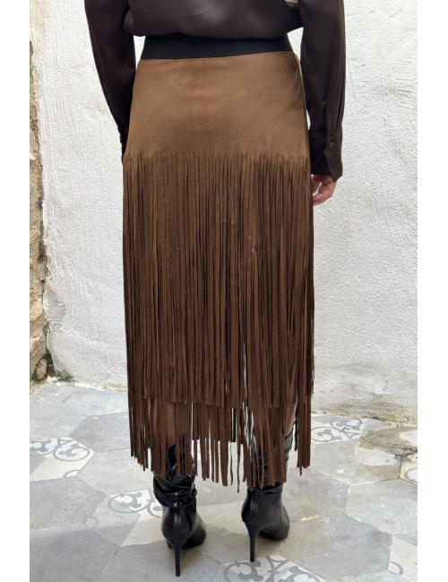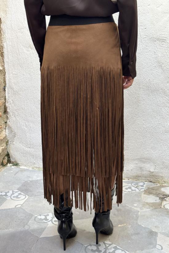 Falda larga con flecos confeccionada en antelina. Cintura elástica que la hace adaptabe hasta la talla 42. Para equilibrar el volumen de la falda, puedes combinarla con una blusa o un top ajustado. La falda que rompe moldes este otoño-invierno, versátil, sofisticada y con un toque vintage.