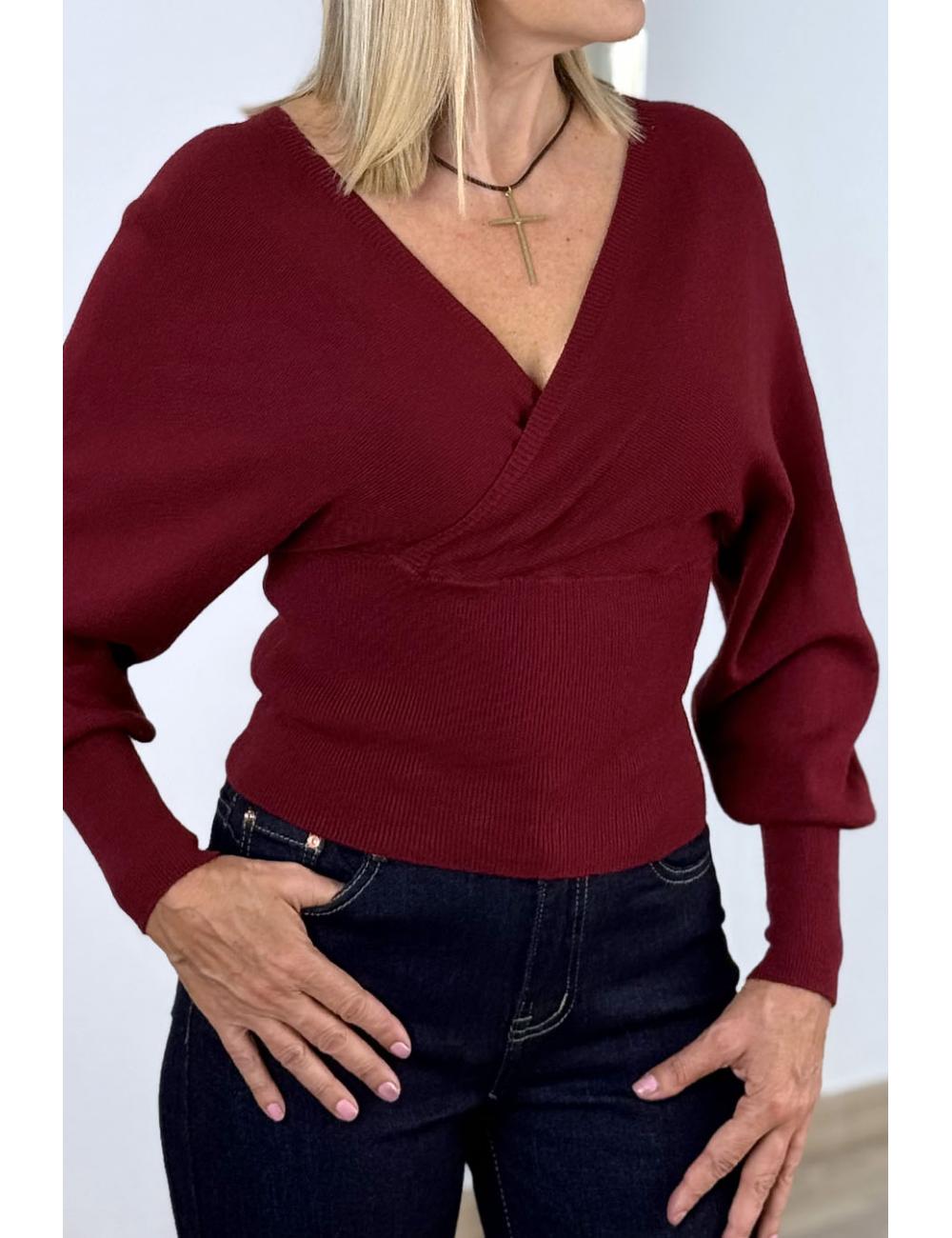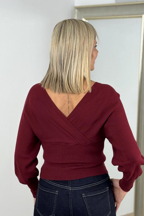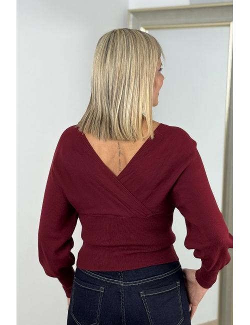 Jersey cruzado delante y detrás confeccionado en punto fino élástico. Manga larga ligeramente abullonada. Cuello en V tanto delante como en la espalda.