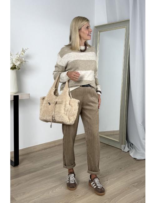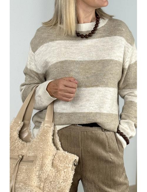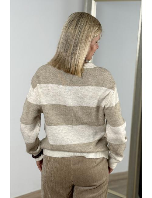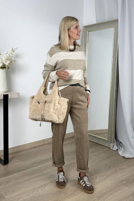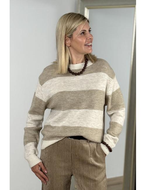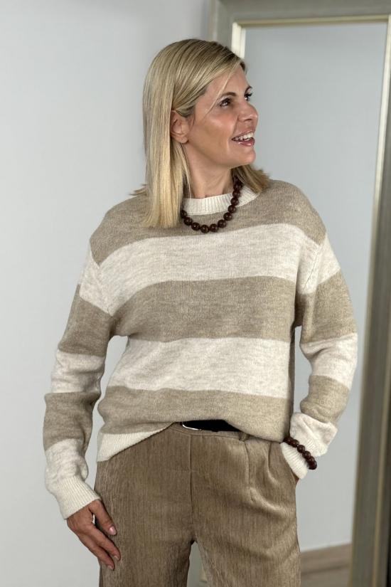 Jersey a rayas horizontales bicolor, confeccionado en lana fina suave elástica. Cuello redondo, puños y cintura acanalados. Un jersey suave y calentito, ideal para darle un toque comfy a tus looks con pantalones y faldas, tanto de diario como de fin de semana.