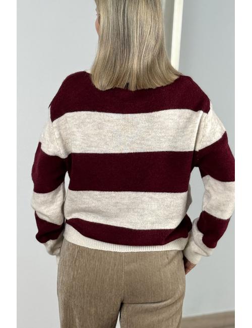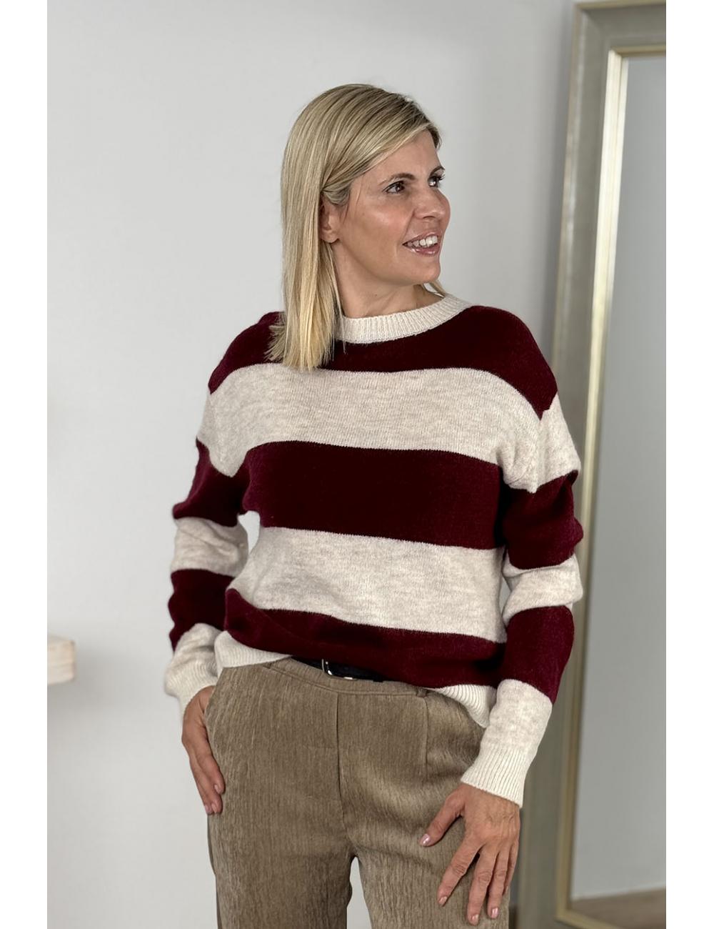Jersey a rayas horizontales bicolor, confeccionado en lana fina suave elástica. Cuello redondo, puños y cintura acanalados. Un jersey suave y calentito, ideal para darle un toque comfy a tus looks con pantalones y faldas, tanto de diario como de fin de semana.