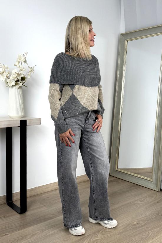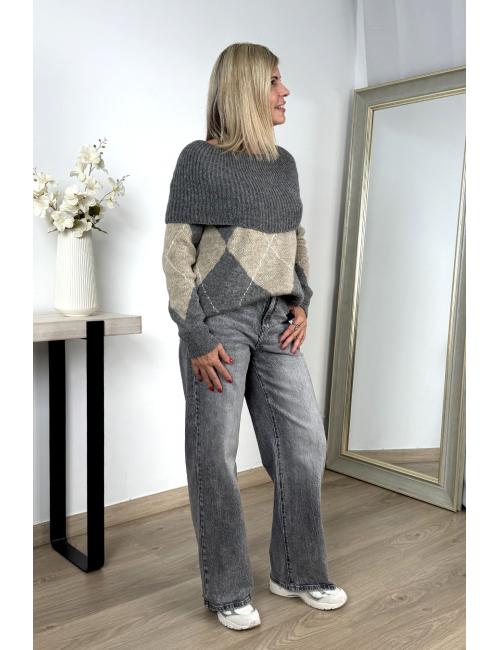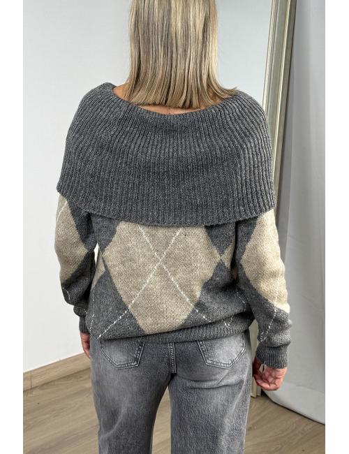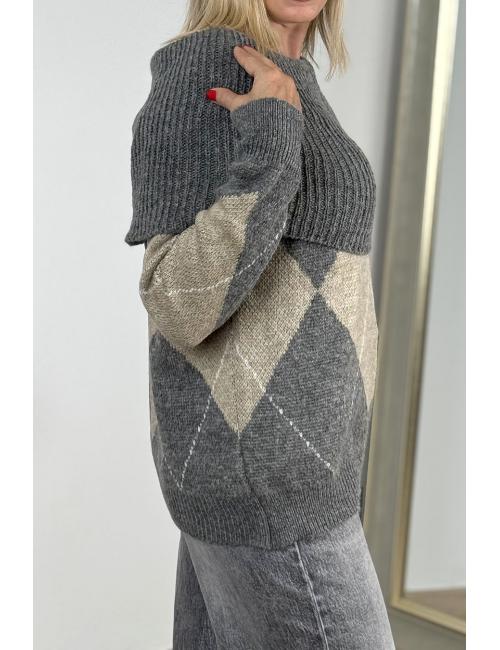 Jersey de lana fina estampado a rombos. Cuello con vuelta estilo bardot.