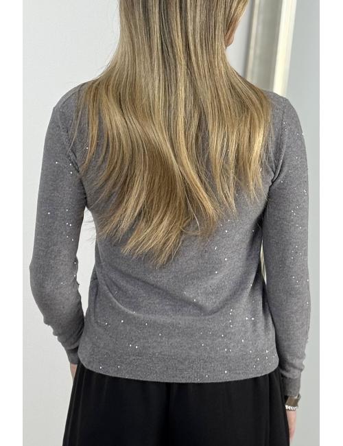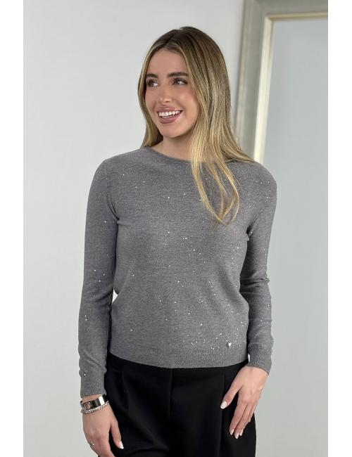 Jersey corto de la fina, jaspeado con lentejuelas pequeñas. Cuello redondo. Detalle de canalé en puños y cintura.