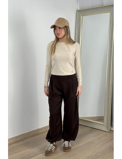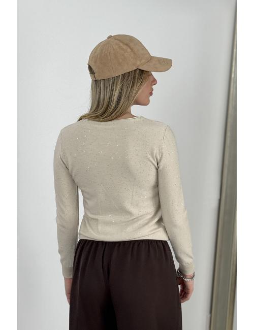 Jersey corto de la fina, jaspeado con lentejuelas pequeñas. Cuello redondo. Detalle de canalé puños.