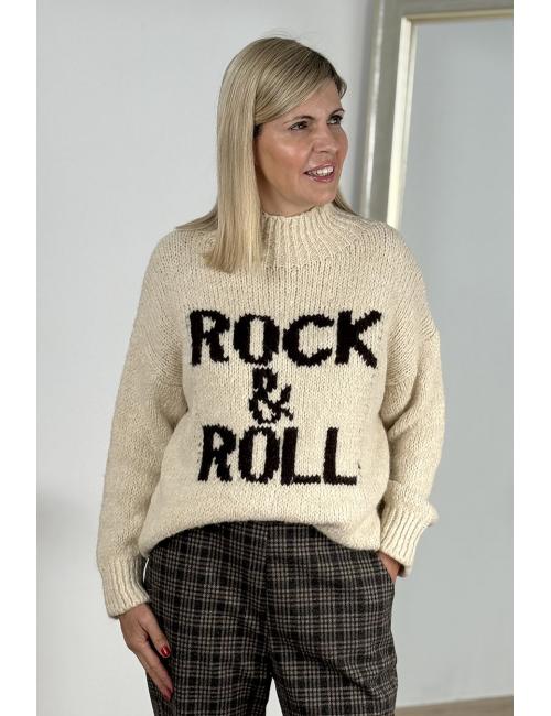 Jersey punto grueso extra suave. Cuello perkins estilo chimenea. Detalle de print delante "Rock and Roll" a contraste. De corte oversize, es amplio y confortable, ideal para looks comfy y sport chic.