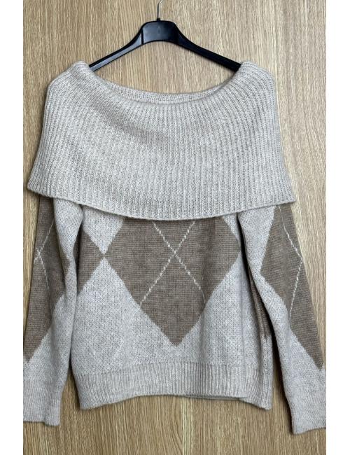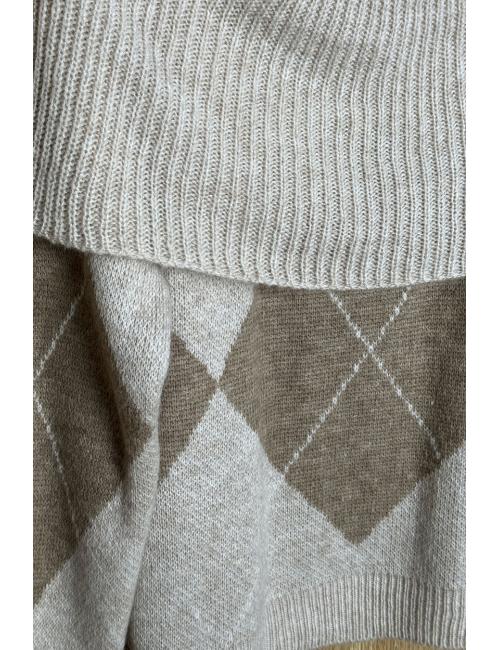 Jersey de lana fina estampado a rombos. Cuello con vuelta estilo bardot.