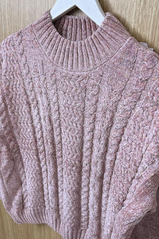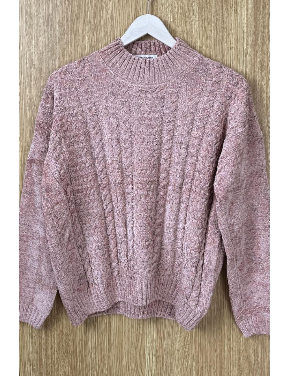 Jersey de punto chenilla tupido y elástico. Trama trenzada vertical con detalles pequeños multicolor. Cuello redondo perkins y puños acanalados.