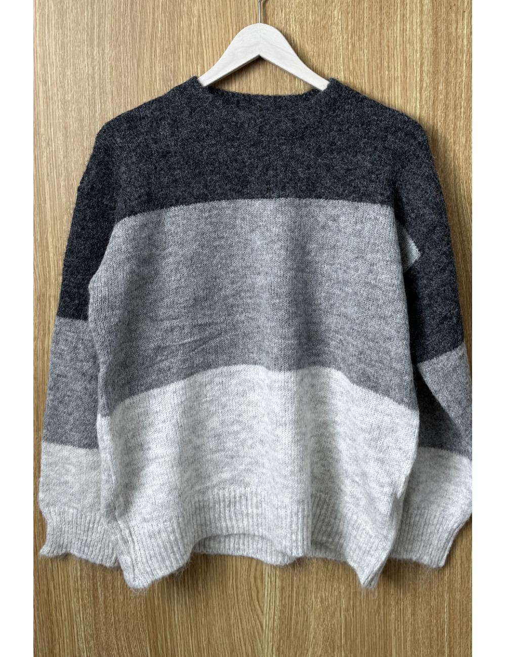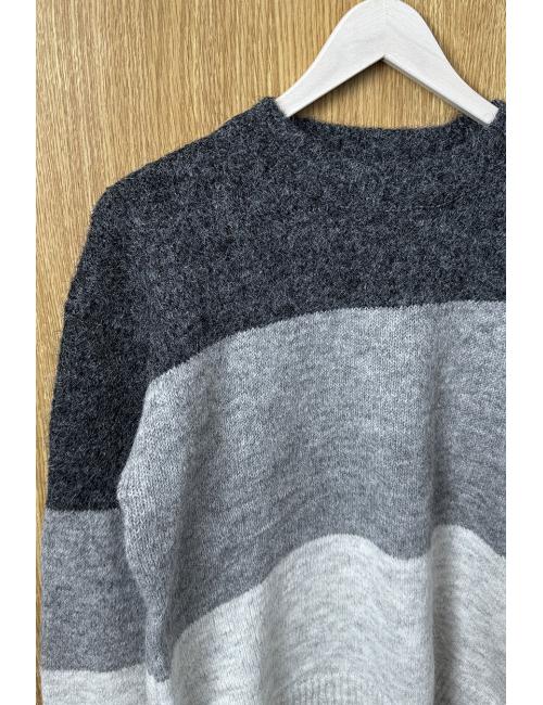 Jersey confeccionado en lana jaspeada extra suave de corte relajado. Cuello redondo, puños y cintura acanalados. Detalle de tres grandes franjas en diversas gamas de la misma tonalidad.