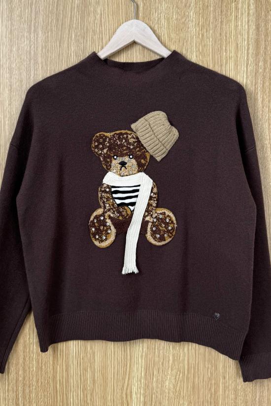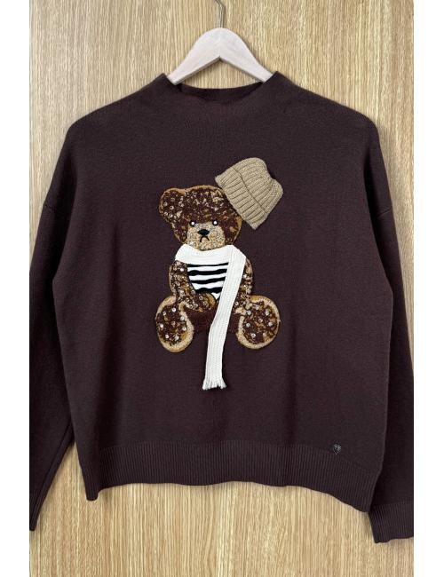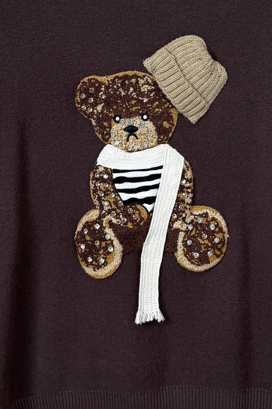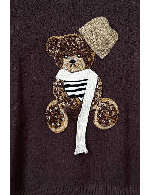 Jersey confeccionado en lana fina extra suave de corte relajado. Cuello perkins y detalle de osito de peluche en relieve bordado con brillantitos, gorro y bufanda.