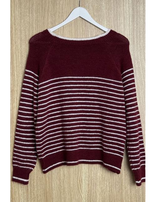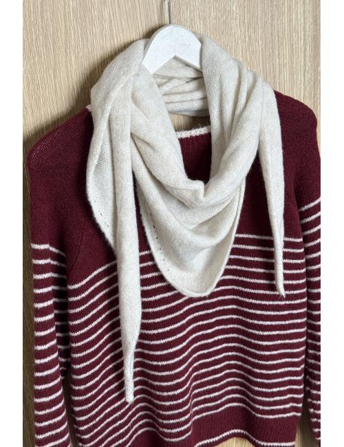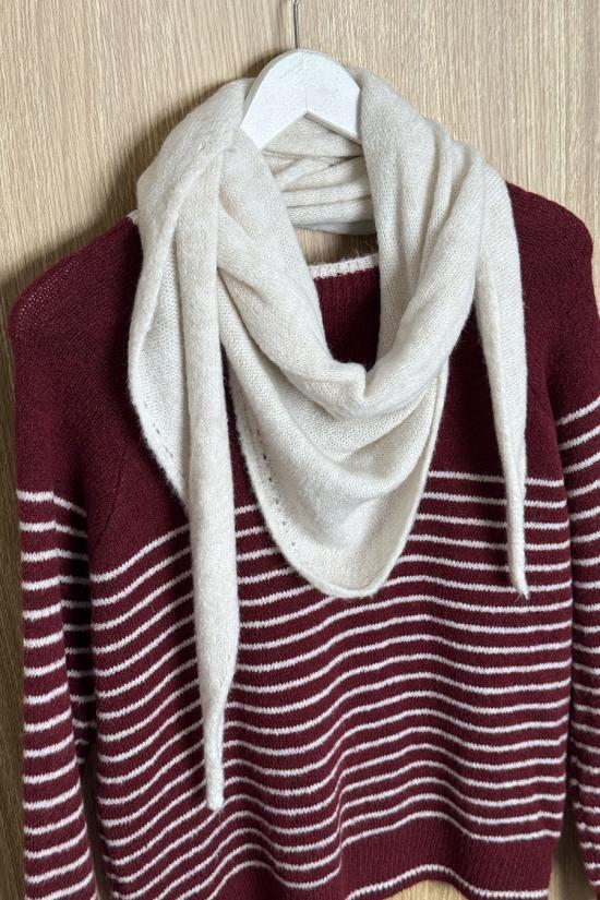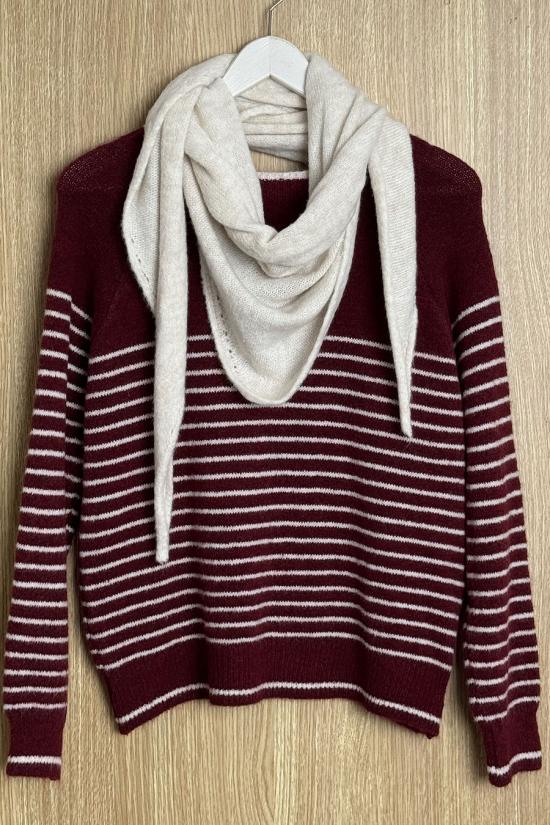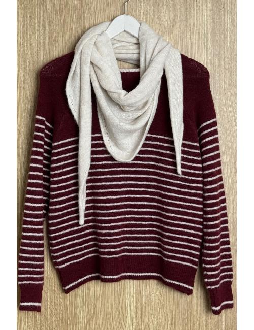 Jersey bicolor, mitad liso y mitad estampado de rayas finas horizontales a contraste que incluye una bufanda del mismo tejido. Corte relajado y cuello redondo. Detalle de canalé en puños y cuello. Confeccionado en punto fino y textura suave. Un jersey estiloso y polivalente para tus outfits de otoño-invierno.