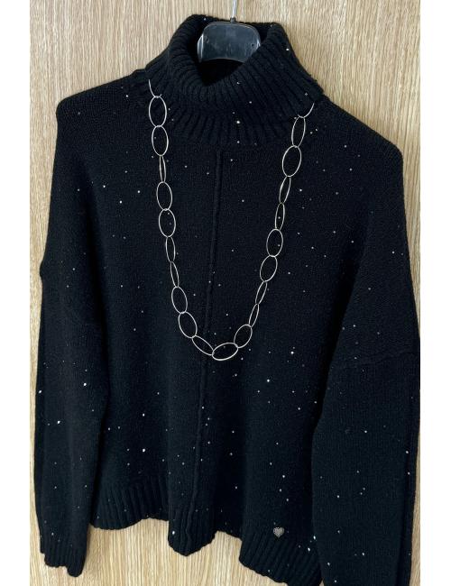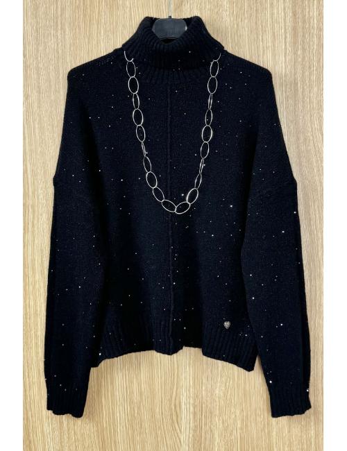 Jersey de manga larga, cuello alto y lentejuelas mini repartidas por toda la prenda. Detalle de costura vertical decorativa en mitad del jersy. Confeccionado en punto liso de grosor fino. Un jersey diferente para tus outfits de estas Fiestas.