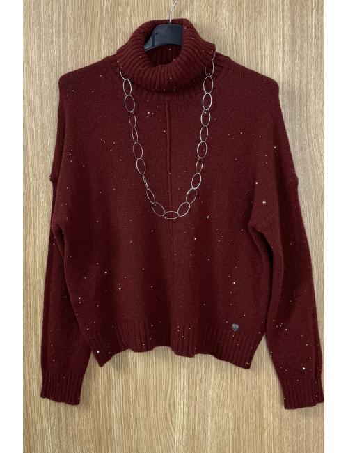 Jersey de manga larga, cuello alto y lentejuelas mini repartidas por toda la prenda. Detalle de costura vertical decorativa en mitad del jersy. Confeccionado en punto liso de grosor fino. Un jersey diferente para tus outfits de estas Fiestas.