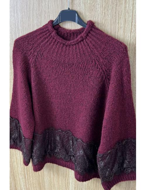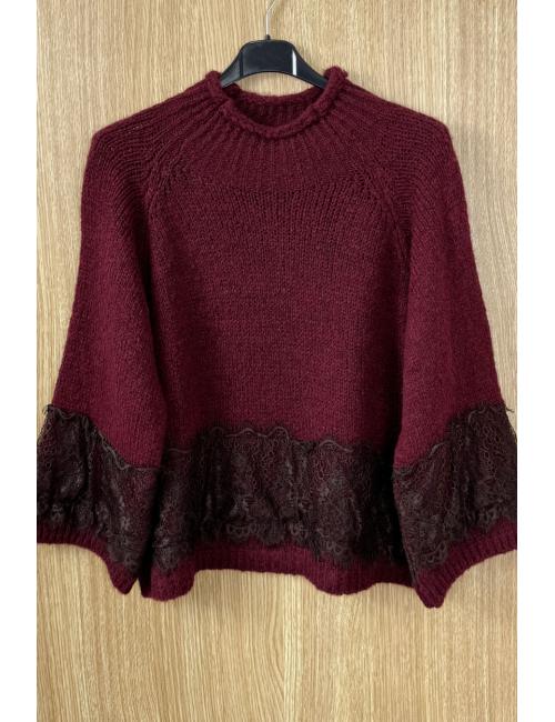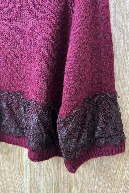 Jersey oversize de manga larga, cuello perkins y detalle de blonda en bajo y puños. Confeccionado en lana de grosor medio. Un jersey original para tu día a día y también para tus looks de estas Fiestas.