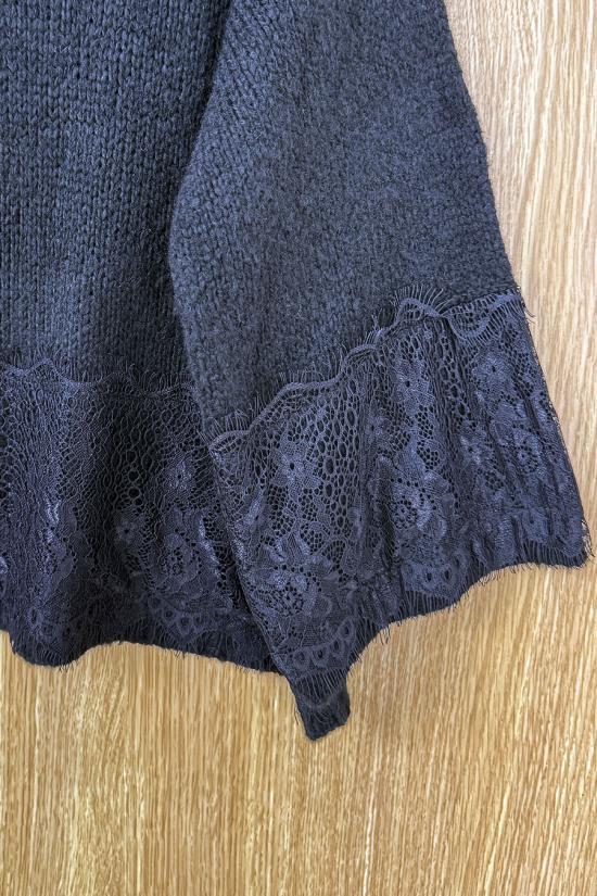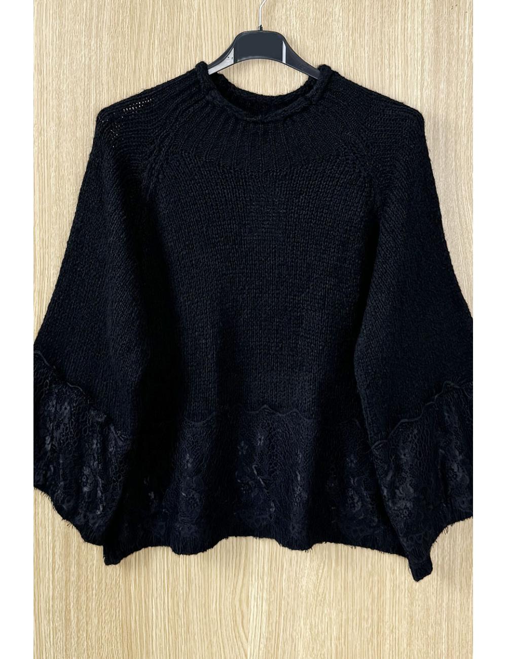 Jersey oversize de manga larga, cuello perkins y detalle de blonda en bajo y puños. Confeccionado en lana de grosor medio. Un jersey original para tu día a día y también para tus looks de estas Fiestas.
