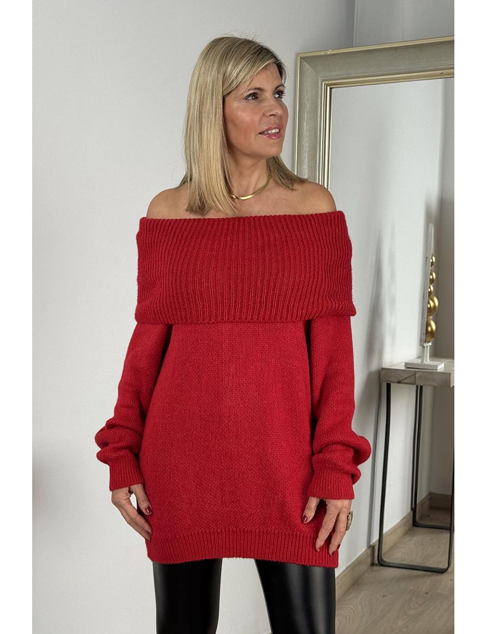 Jersey de lana suave oversize que puede llevarse como jersey y como vestido. Detalle de acabado canalé en puños y cuello. Cuello con vuelta estilo bardot.