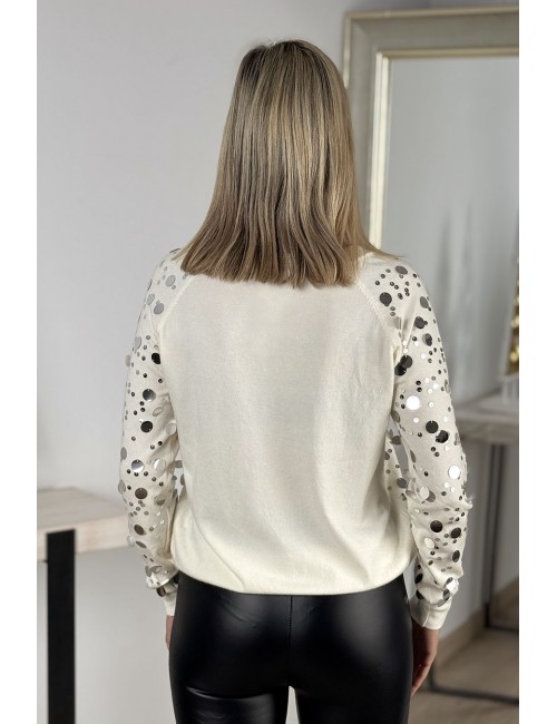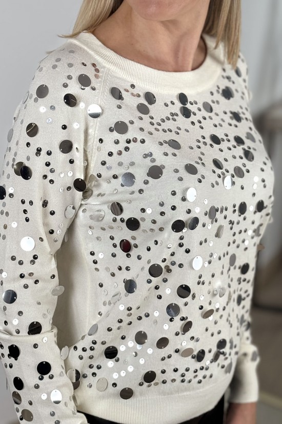 Jersey de lana fina de corte clásico con lentejuelas de diversos tamaños delante y en mangas. Espalda lisa y canalé en cuello, puños y cintura. Deslumbra con el brillo de uno de los jerséis más originales y elegantes de nuestra colección.