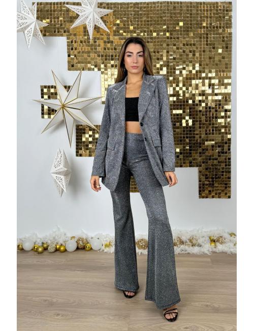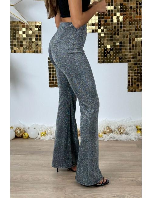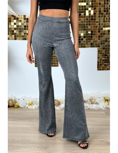 Pantalón campana confeccionado con téxtil brillante. Cintura elástica para que pueda adaptarse a varias tallas.