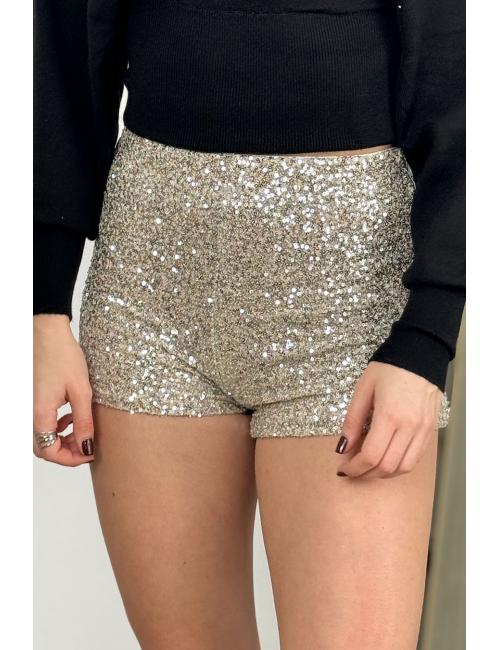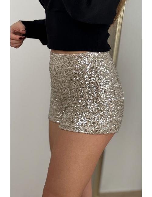 Short mini de lentejuelas con goma en la cintura, adaptable a varias tallas. Forro interior de punto fino.