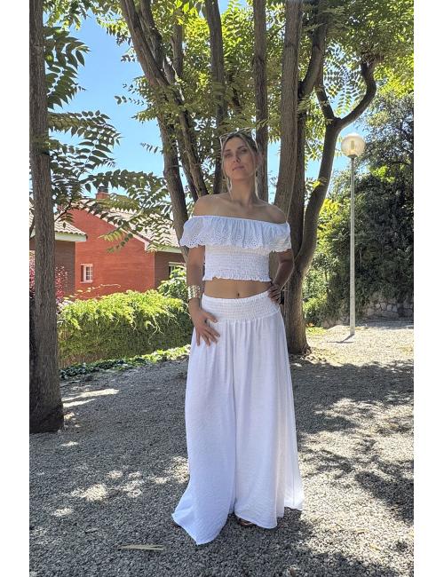 Pantalón palazzo fluído de algodón fino. Goma ancha en la cintura nido de abeja para que se adapte a varias tallas.