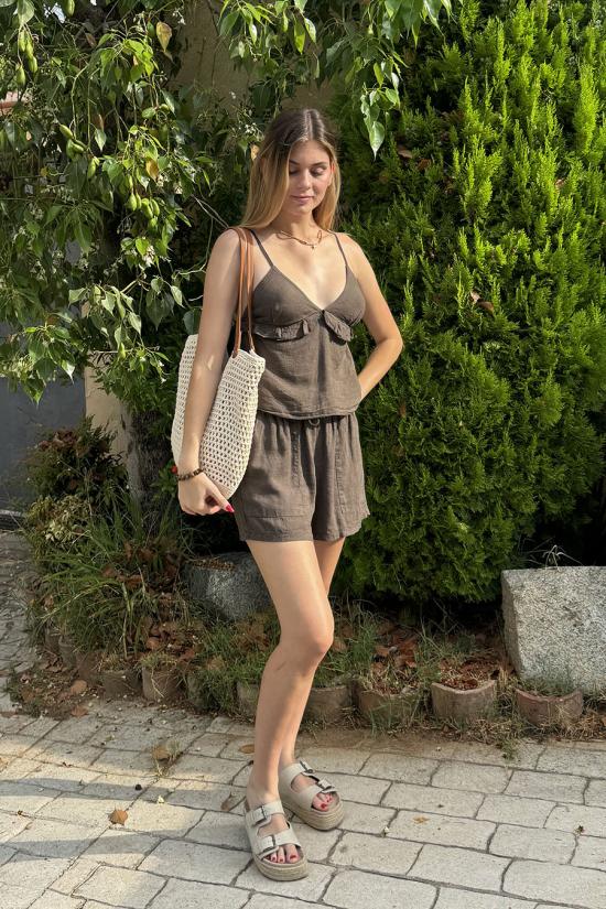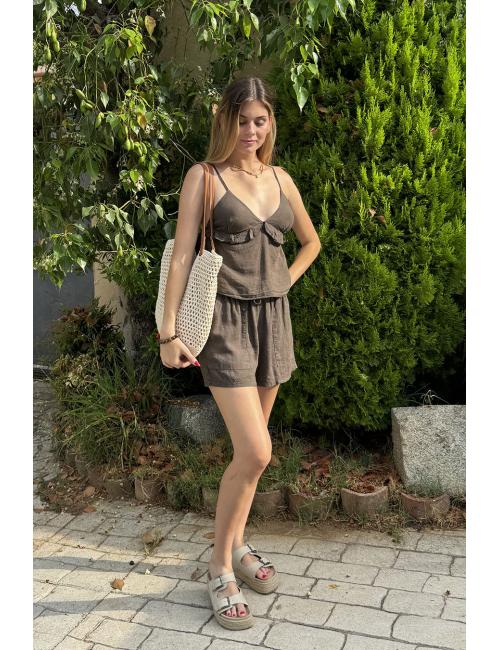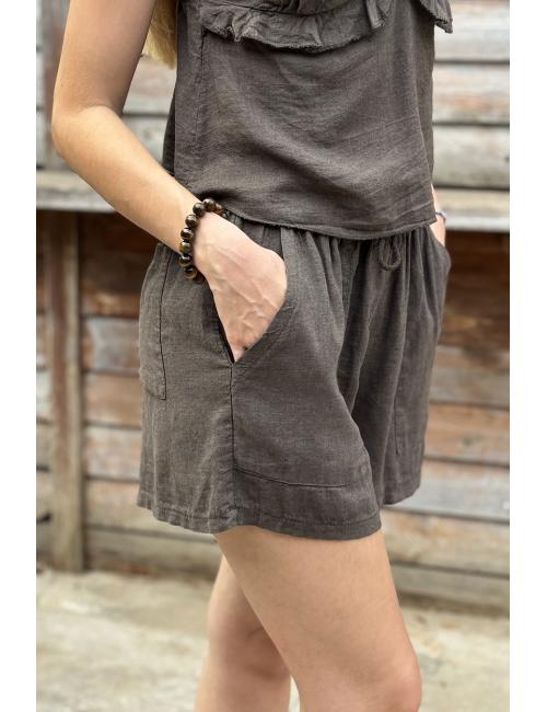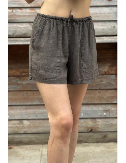 Shorts confeccionados en lino. De corte fluido y cintura elástica con un cordón que permmite un ajuste a medida. Incluye dos bolsillos delante y dos detrás.