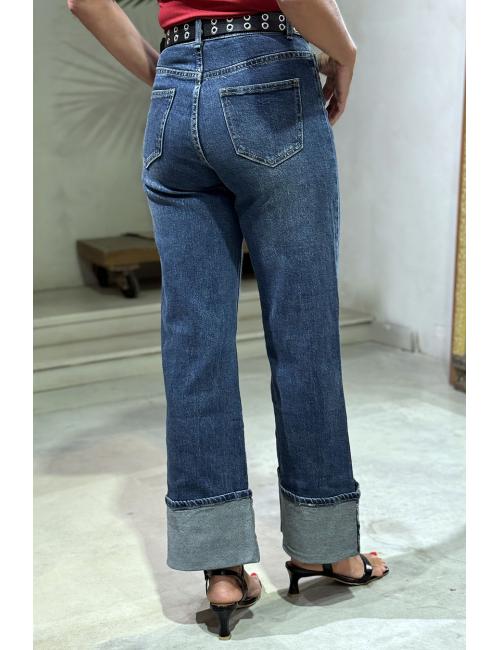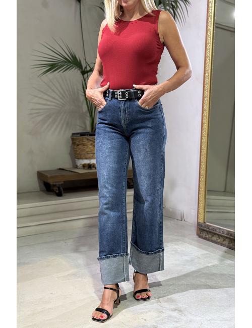 Pantalón vaquero azul delavado de corte wide leg, tiro alto y bajo vuelto. Confeccionados en tejido denim elástico. Pernera ancha recta. Trabillas en la cintura. Cinco bolsillos, delanteros y traseros. Cierre con cremallera y botón metálico.