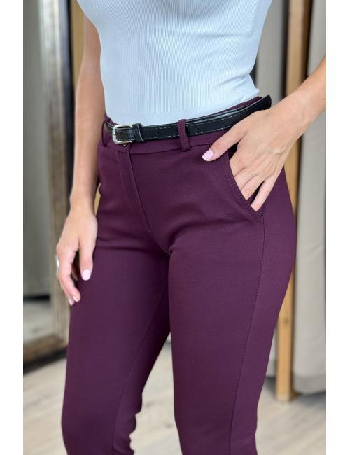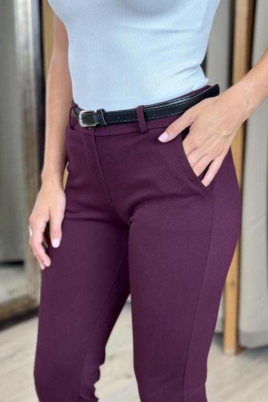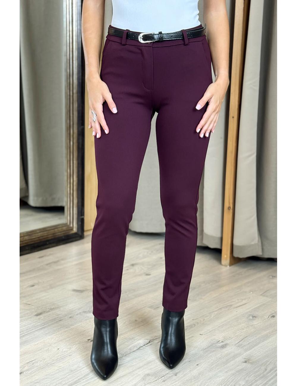 Pantalón de traje confeccionado en tejido punto roma elástico. Tiro medio, 2 bolsillos laterales y uno detrás. Incluye cinturón de piel sintética con hebilla metálica.