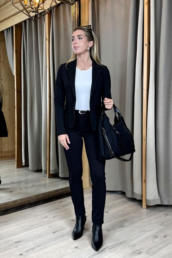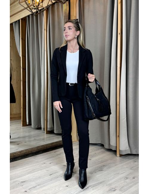 Pantalón de traje confeccionado en tejido punto roma elástico. Tiro medio, 2 bolsillos laterales y uno detrás. Incluye cinturón de piel sintética con hebilla metálica.