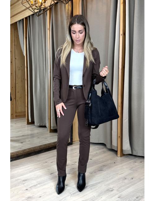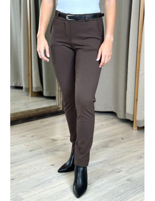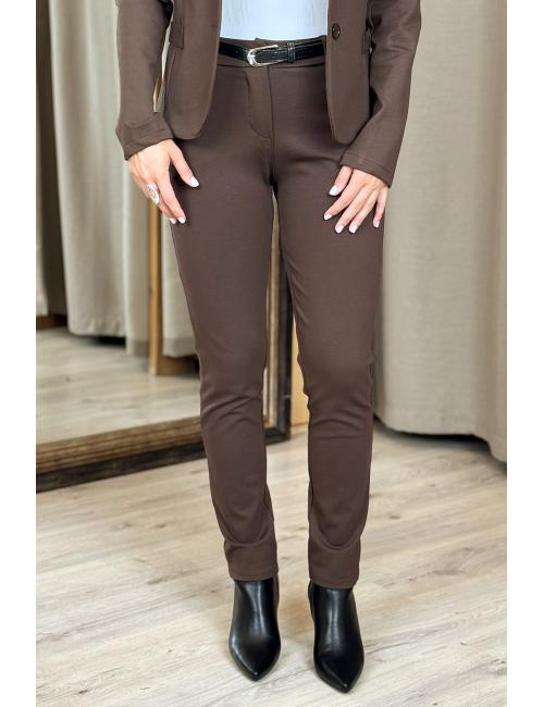Pantalón de traje confeccionado en tejido punto roma elástico. Tiro medio, 2 bolsillos laterales y uno detrás. Incluye cinturón de piel sintética con hebilla metálica.