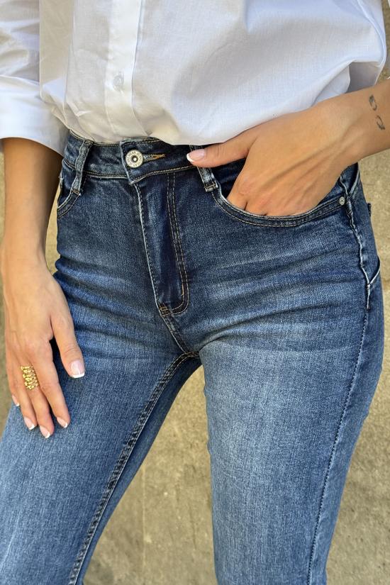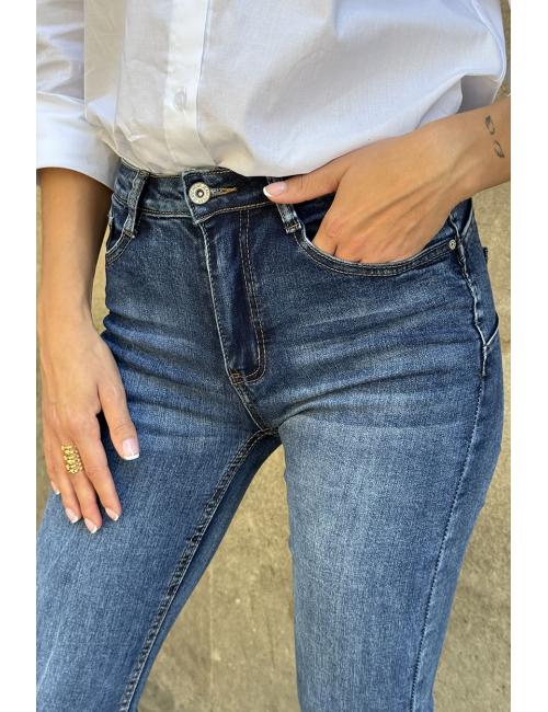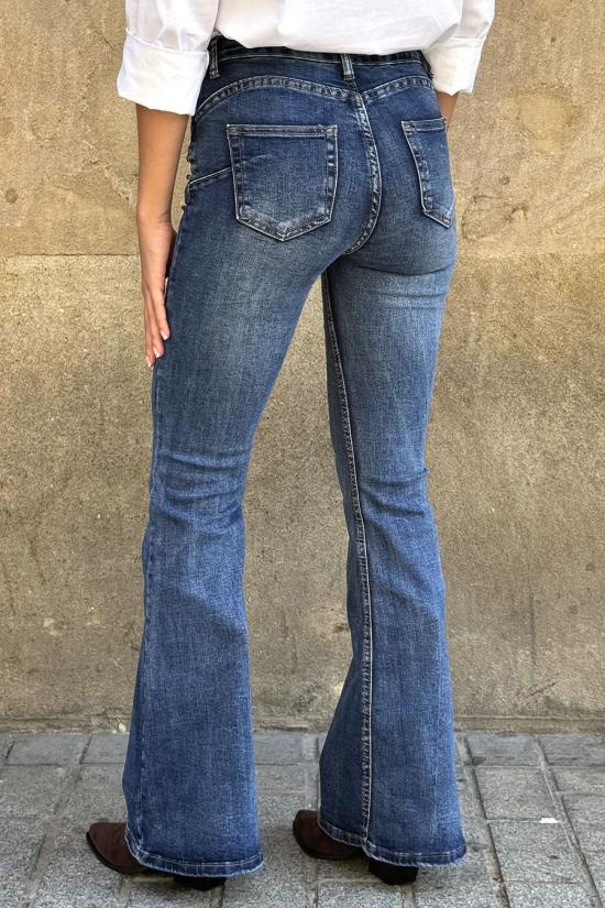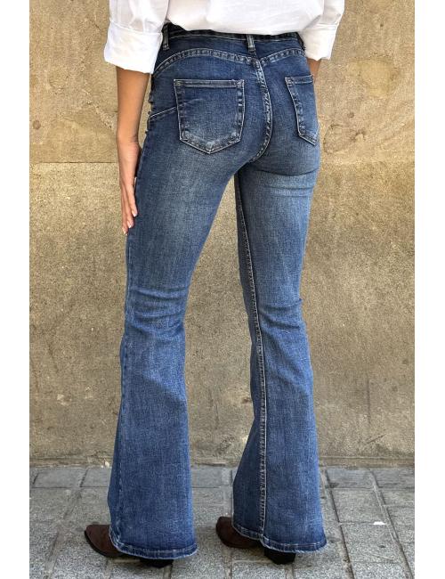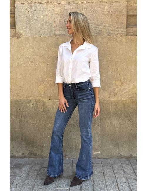 Pantalón vaquero flare campana elástico de tiro medio y efecto push-up. Confeccionados en tejido denim delavado.