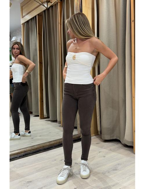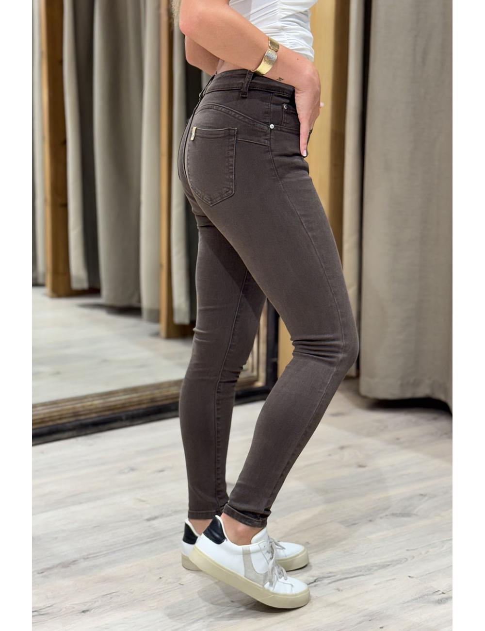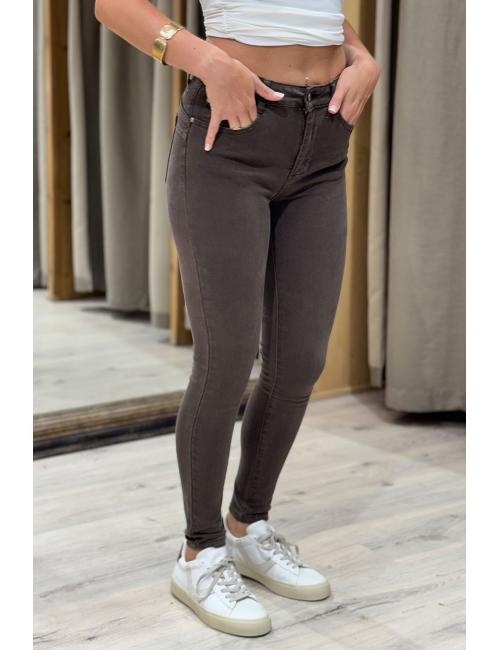 Jeans pitillo básicos confeccionados en tejido elástico de tiro medio. Tejido de tacto súper suave. Bolsillos delante y detrás. Cierre con cremallera y botón metálico.