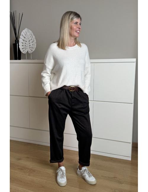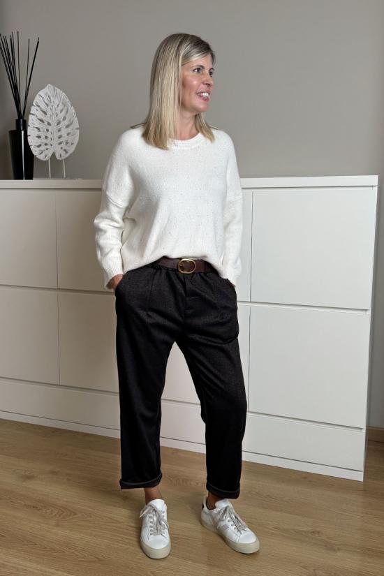 Pantalón jogger de tiro medio con pinzas. Cintura elástica y cordón para un mejor y más cómodo ajuste. Dos bolsillos laterales. Tejudo texturado a rayas. Un pantalón cómodo y perfecto para tus looks comfy de oficina o fin de semana.