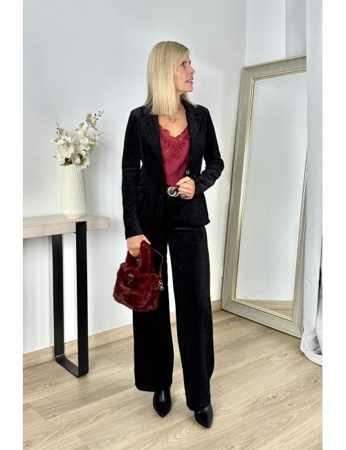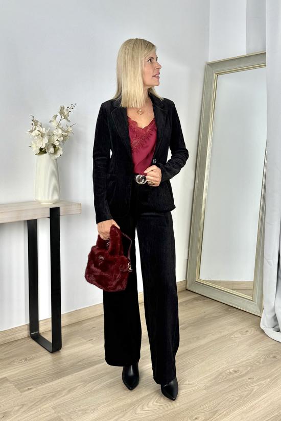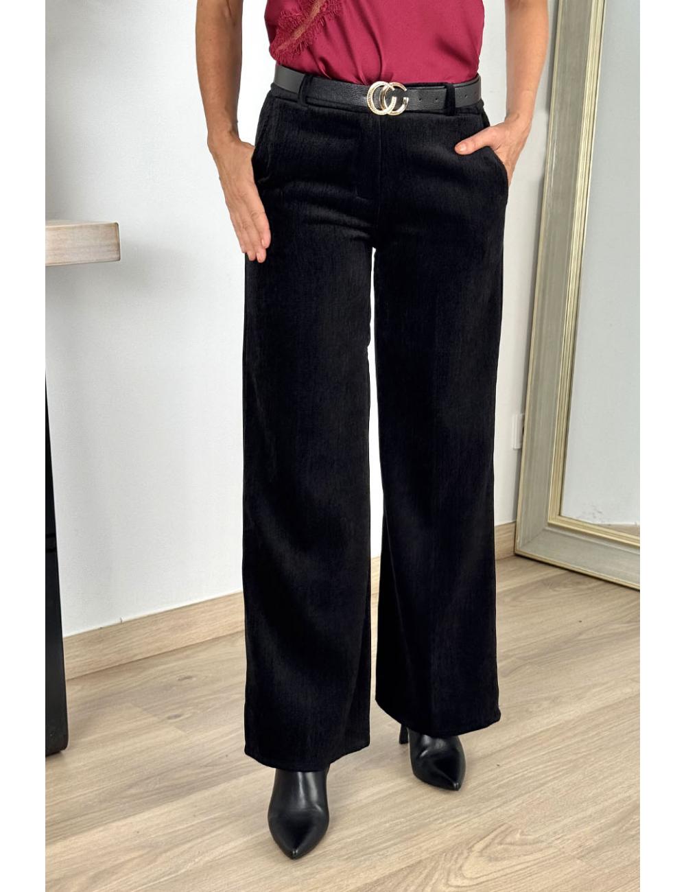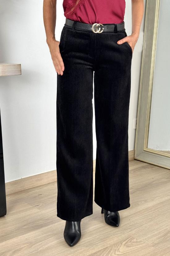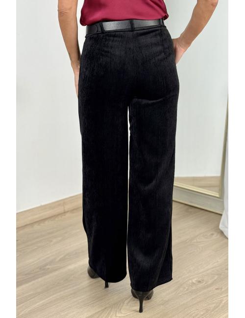 Pantalón de traje confeccionado en tejido aterciopelado extra suave. Corte recto y tiro medio. Dos bolsillos laterales y cinturón de piel sintética con hebilla dorada.