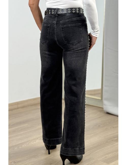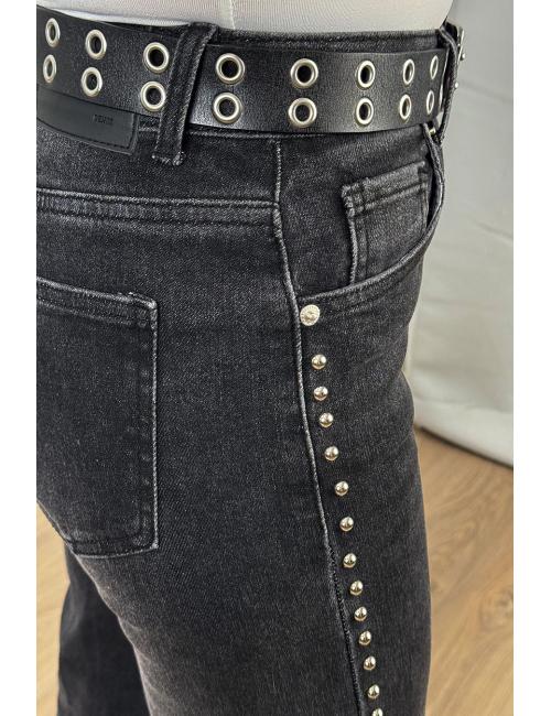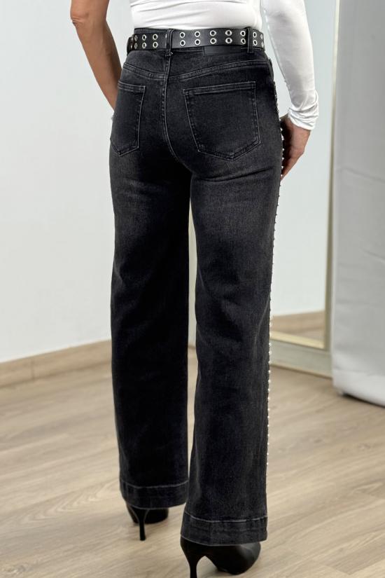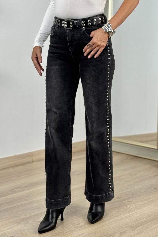 Jeans corte palazzo de tiro medio con detalle de tachuelas metálicas en el lateral de ambas perneras. Confeccionados en tejido denim elástico delavado. Bolsillos delante y detrás, cierre con cremallera y botón metálico.