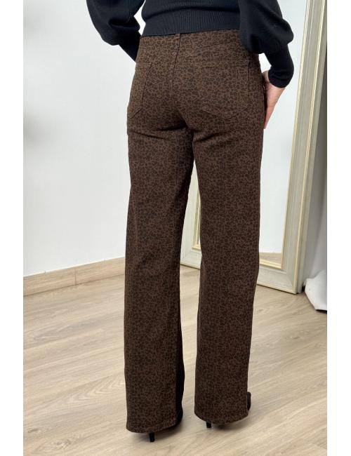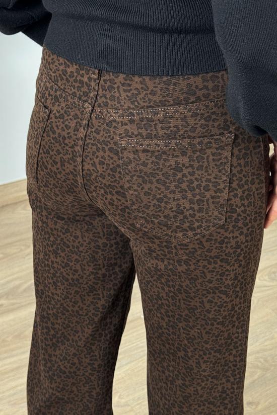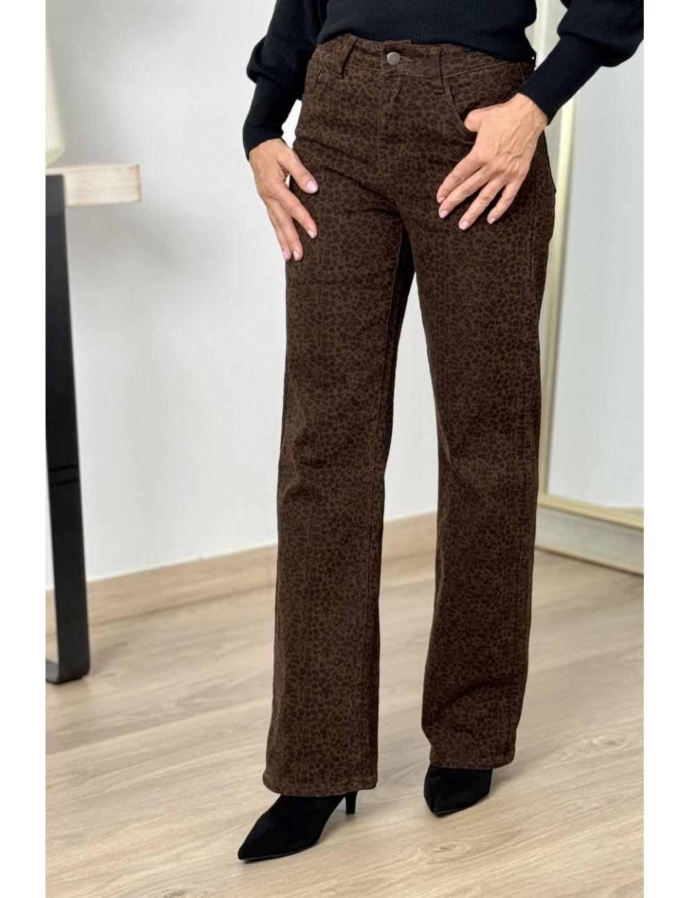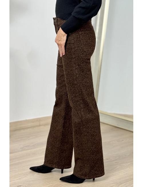 Pantalón wide leg de tiro medio confeccionado en algodón elástico estampado animal print. Cinco bolsillos y cierre con botón y cremallera. Un pantalón cómodo, versátil y estiloso, ideal para tus looks de diario o de fin de semana.