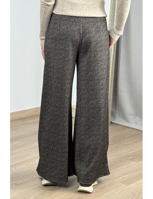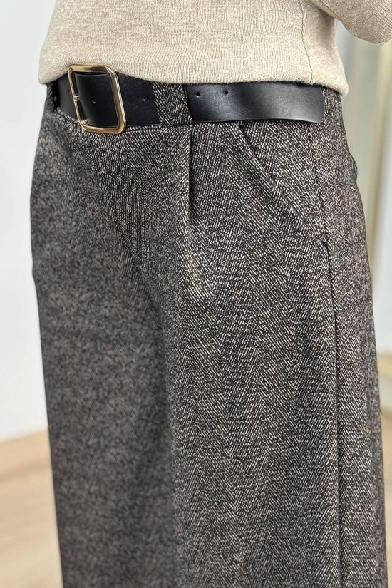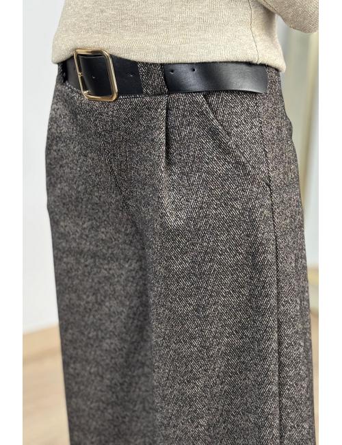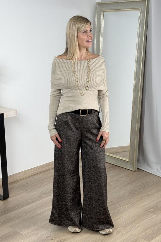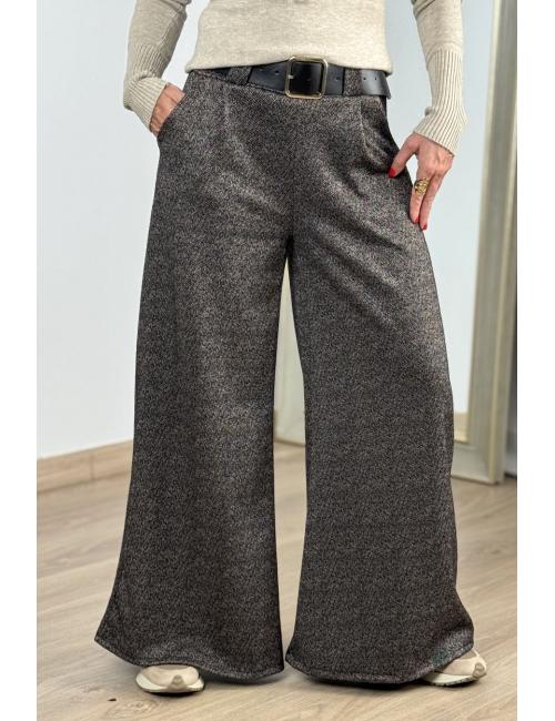 Pantalón palazzo confeccionado en lana fina fluída extra suave y elástica. Tiro alto, dos bolsillos laterales, trabillas y cinturón ancho de piel sintética marrón con hebilla dorada. Cintura elástica adaptable a varias tallas.