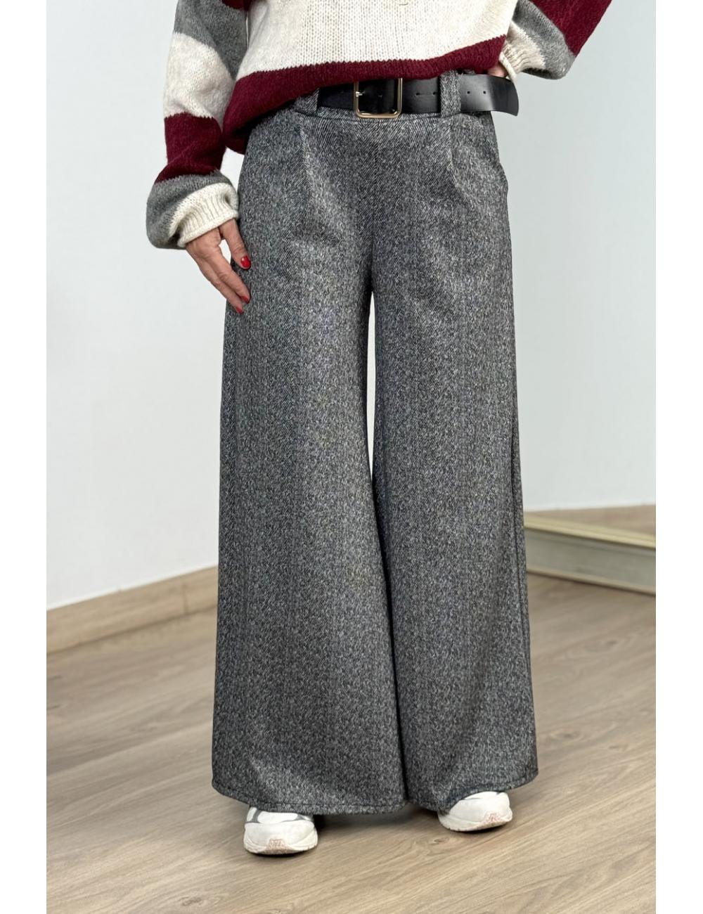 Pantalón palazzo confeccionado en lana fina fluída extra suave y elástica. Tiro alto, dos bolsillos laterales, trabillas y cinturón ancho de piel sintética marrón con hebilla dorada. Cintura elástica adaptable a varias tallas.