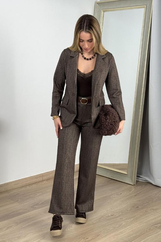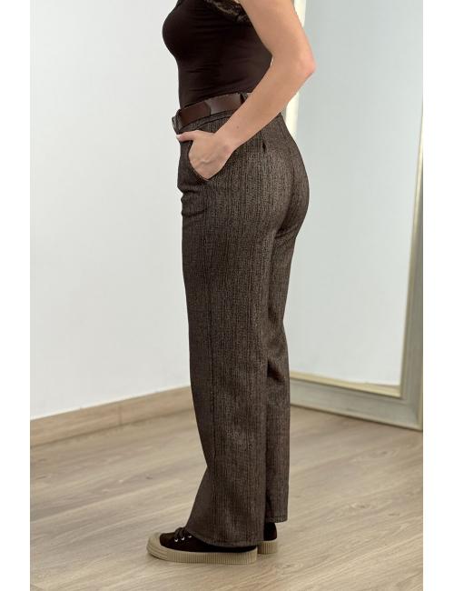 Pantalón palazzo confeccionado en tejido de punto elástico aterciopelado suave, texturado y un punto brillante. Tiro alto, dos bolsillos y goma en la parte trasera de la cintura. Incluye cinturón polipiel con hebilla dorada. Un pantalón diferente y estiloso, ideal para tus looks de oficina y también para ocasiones especiales y celebraciones.
