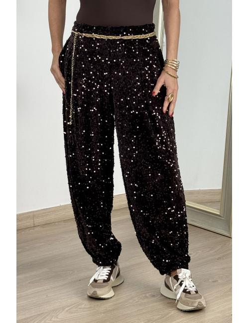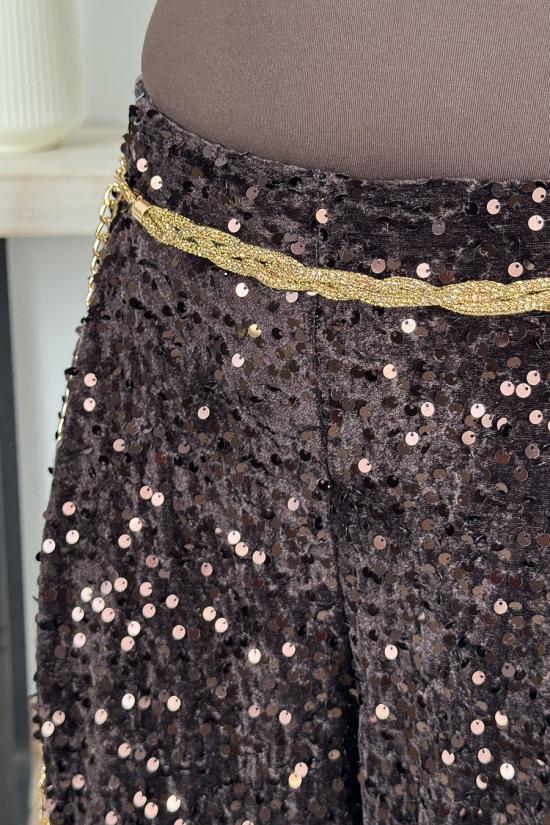 Pantalón bombacho confeccionado en vellut y lentejuelas. Cintura elástica que lo hace adaptable a varias tallas. Goma en bajo y dos bolsillos laterales. Un pantalón original, elegante y confortable para que brilles como nunca en tus celebraciones y también en tus outfits de diario y comfy