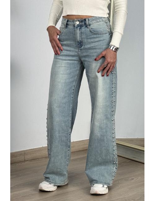 Pantalón vaquero wide leg de tiro medio con detalle de doble fila de tachitas en laterales. Confeccionados en tejido denim elástico delavado y cierre con botón y cremallera.