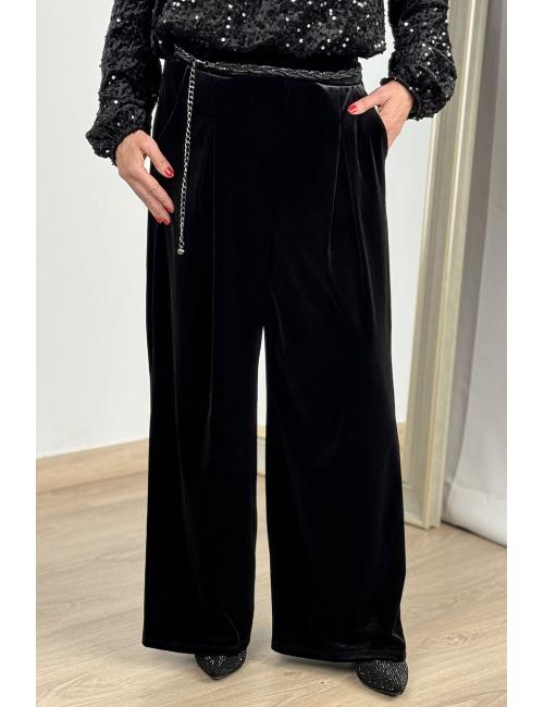 Pantalón palazzo confeccionado en símil terciopelo. Tiro medio, pinzas delante y dos bolsillos laterales. Cintura elástica que lo hace compatible con varias tallas.