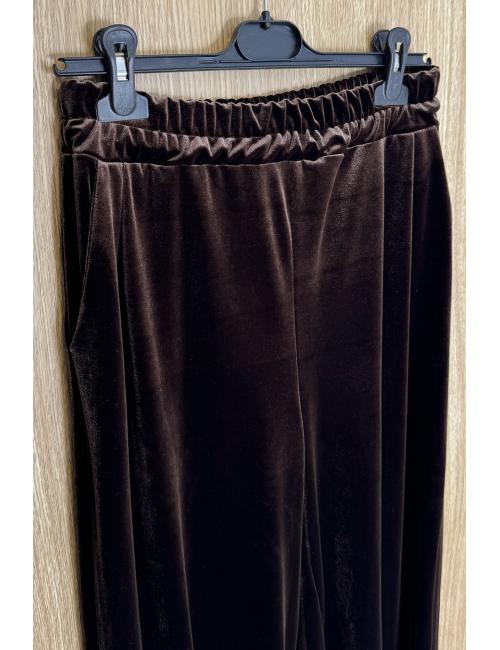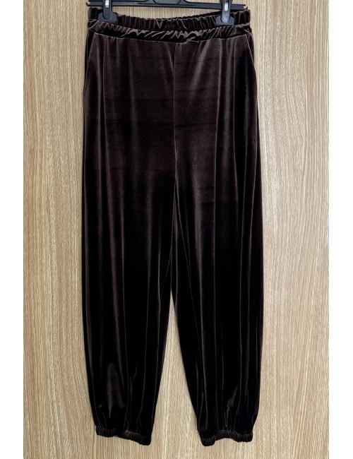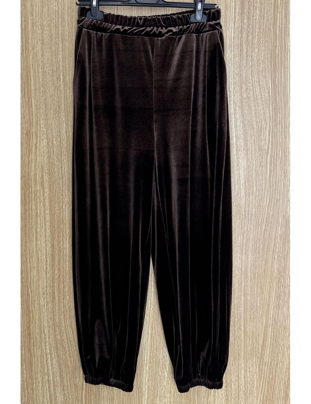 Pantalón bombacho confeccionado en símil terciopelo. Tiro medio y dos bolsillos laterales. Bajo engomado y cintura elástica que lo hace compatible con varias tallas.