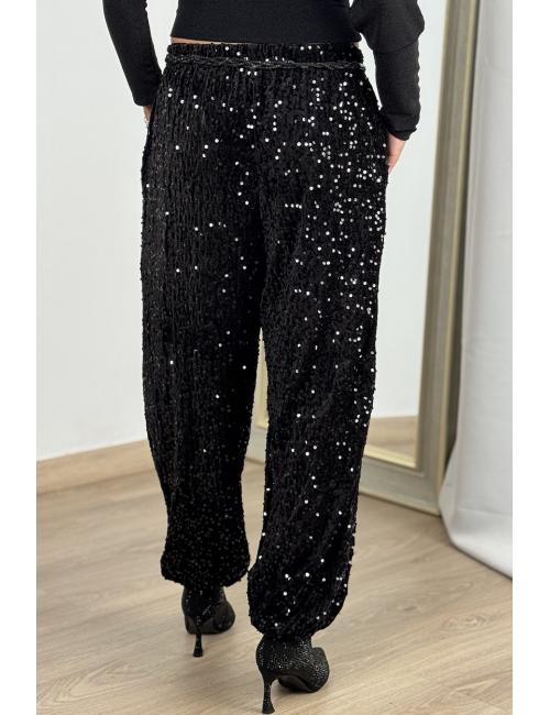 Pantalón bombacho confeccionado en vellut y lentejuelas. Cintura elástica que lo hace adaptable a varias tallas. Goma en bajo y dos bolsillos laterales. Un pantalón original, elegante y confortable para que brilles como nunca en tus celebraciones y también en tus outfits de diario y comfy