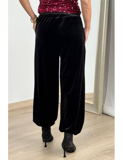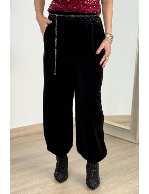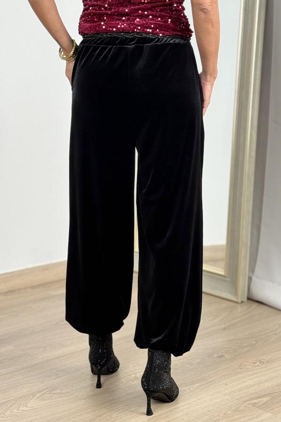 Pantalón bombacho confeccionado en símil terciopelo. Tiro medio y dos bolsillos laterales. Bajo engomado y cintura elástica que lo hace compatible con varias tallas.