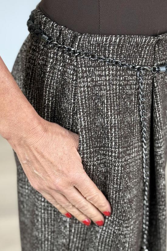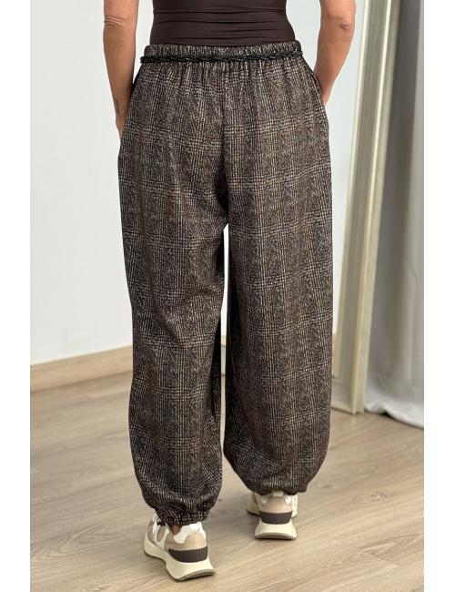 Pantalón bombacho con pinzas, confeccionado en tejido afelpado a cuadros jaspeados. Dos bolsillos laterales, cintura y bajos elásticos que lo hacen adaptable a varias tallas.