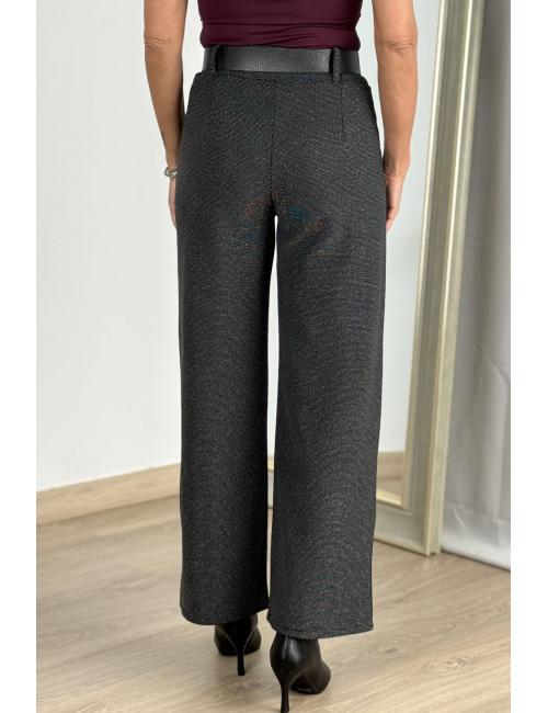 Pantalón palazzo de tiro alto confeccionado en tejido de punto texturado con puntitos brillantes. Dos bolsillos y cinturón ancho de polipiel con hebilla dorada cuadrada. Un pantalón diferente y estiloso, ideal para tus looks de oficina y también para ocasiones especiales y celebraciones.