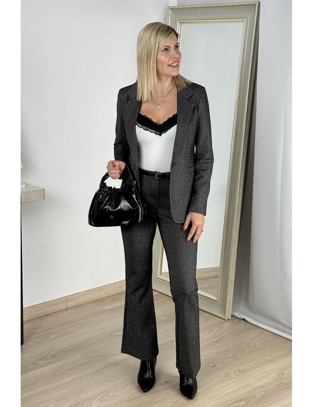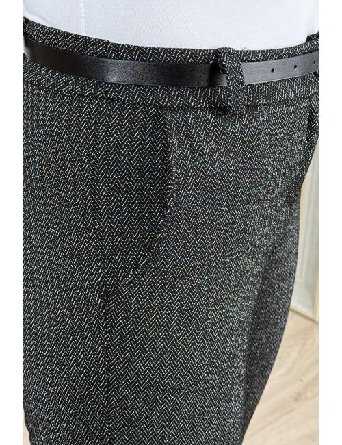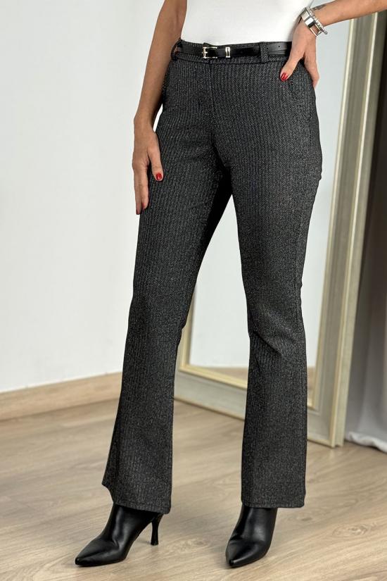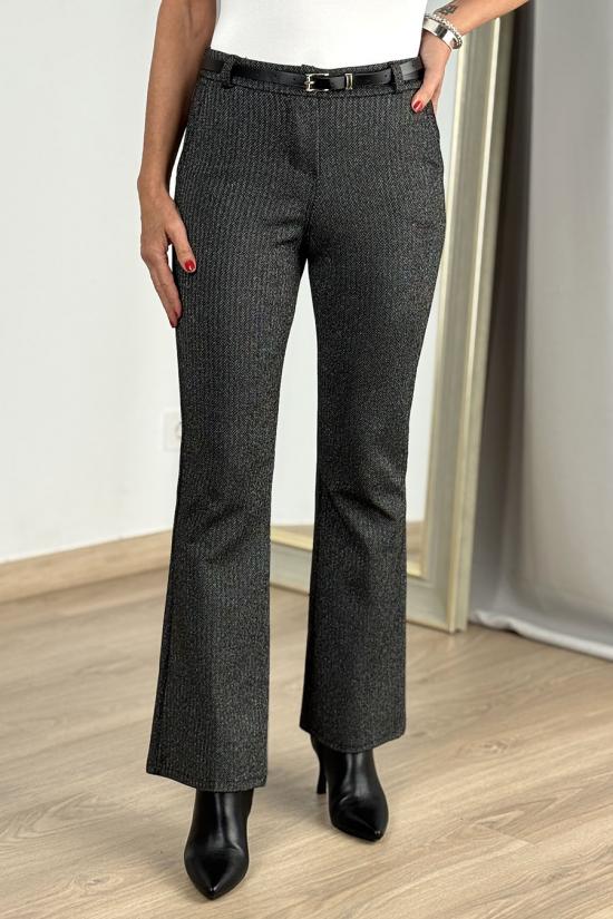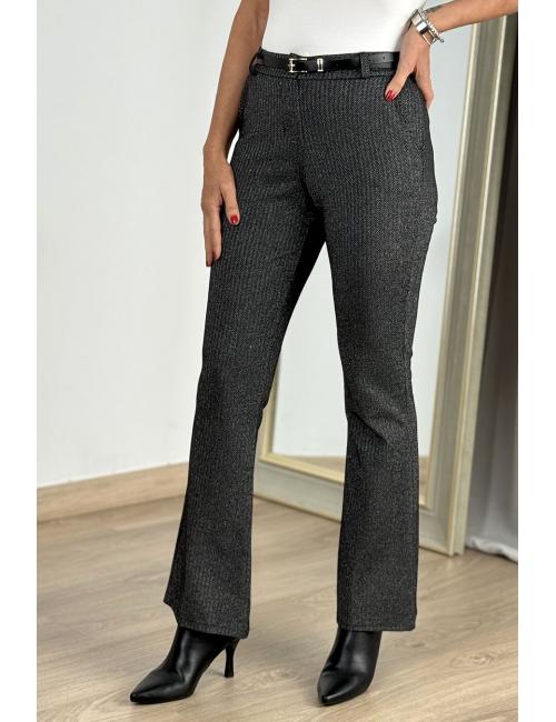 Pantalón campana confeccionado en tejido de punto elástico combinado con lurex brillante en forma de espiga. Tiro medio. Incluye un cinturón de piel sintética con hebilla dorada. Un pantalón diferente y estiloso, ideal para tus looks de oficina y también para ocasiones especiales y celebraciones.