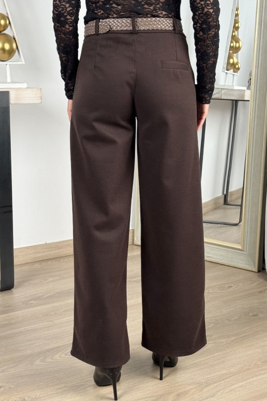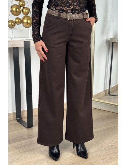 Pantalón palazzo de tiro alto confeccionado en tejido de paño suave. Dos bolsillos laterales y cinturón trenzado de polipiel con hebilla metálica cuadrada. Un pantalón cómodo y estiloso, ideal para tus looks de oficina y también para ocasiones especiales y celebraciones.