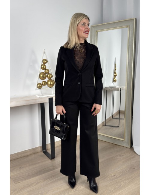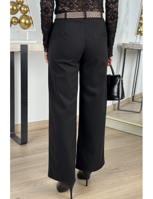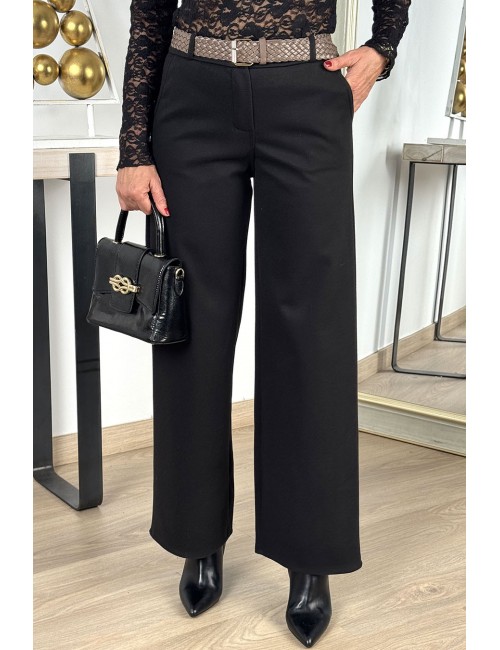 Pantalón palazzo de tiro alto confeccionado en tejido de paño suave. Dos bolsillos laterales y cinturón trenzado de polipiel con hebilla metálica cuadrada. Un pantalón cómodo y estiloso, ideal para tus looks de oficina y también para ocasiones especiales y celebraciones.